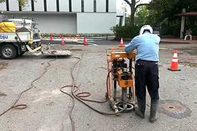 舗装コア・ボーリング施工の様子目的に合わせたコンパクトな電動式のダイヤモンド・ドリル。