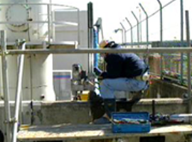 トラックレールに本体を装着し、ダイヤモンド・ブレードでコンクリート構造物を切断。